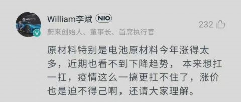 对于涨价一事,李斌表示,“原材料特别是电池原材料今年涨得太多,近期也看不到下降趋势,本来想扛一扛,疫情这么一搞更扛不住了,涨价也是迫不得己啊,还请大家理解。”