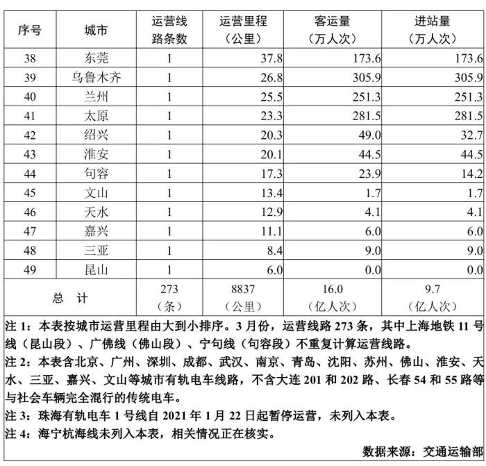 3月份,新增广州地铁22号线(首通段)运营线路1条、运营里程18.2公里;51个城市完成客运量环比增加0.4亿人次、增长2.6%,同比去年3月减少5.7亿人次、下降26.3%。