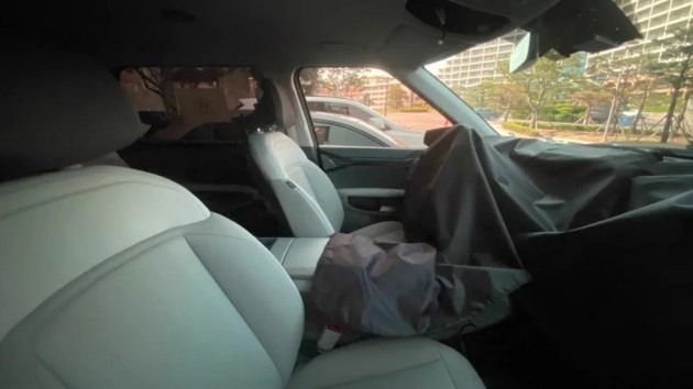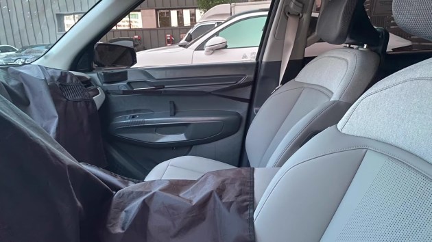 起亚 EV9 内饰虽然同样采用了伪装,但可以看到座椅采用了类似织物和皮革拼接的设计,而且头枕的造型非常独特,可能参考了办公室人体工学椅的设计。