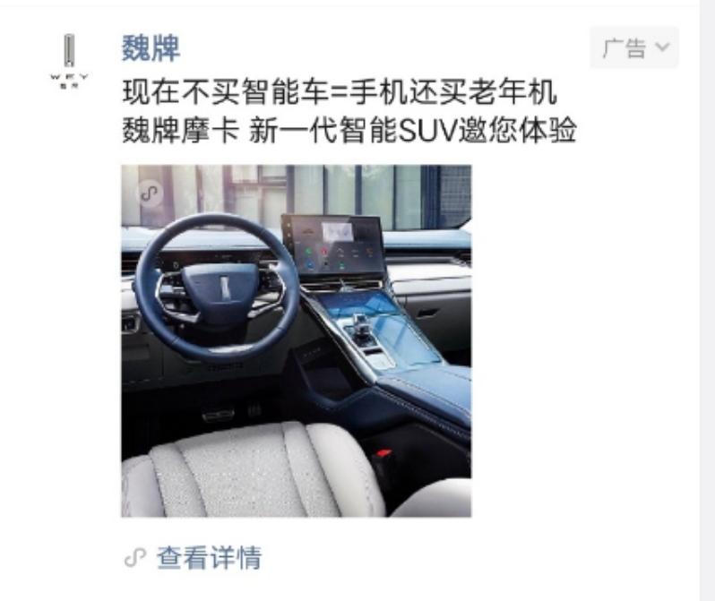 值得一提的是,华为余承东在 2022 粤港澳车展表示,纯燃油车时代会迅速结束,现在还买燃油车,就像智能手机时代买功能机。而网友发现,魏牌汽车在朋友圈投放的广告就写有“现在不买智能车 = 手机还买老年机”,疑似借鉴了余承东的话。