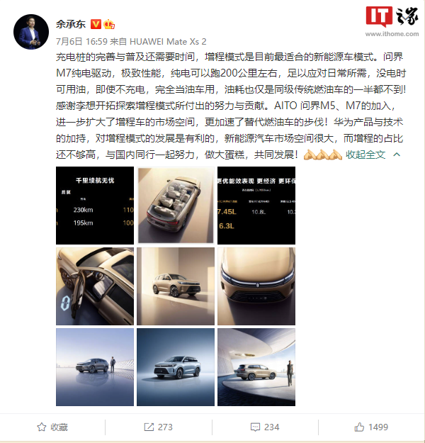 不仅如此,余承东昨日也在微博发文称,“充电桩的完善与普及还需要时间,增程模式是目前最适合的新能源车模式。问界 M7 纯电驱动,极致性能,纯电可以跑 200 公里左右,足以应对日常所需,没电时可用油,即使不充电,完全当油车用,油耗也仅是同级传统燃油车的一半都不到! 感谢李想开拓探索增程模式所付出的努力与贡献。AITO 问界 M5、M7 的加入,进一步扩大了增程车的市场空间,更加速了替代燃油车的步伐!华为产品与技术的加持,对增程模式的发展是有利的,新能源汽车市场空间很大,而增程的占比还不够高,与国内同行一起努力,做大蛋糕,共同发展!”