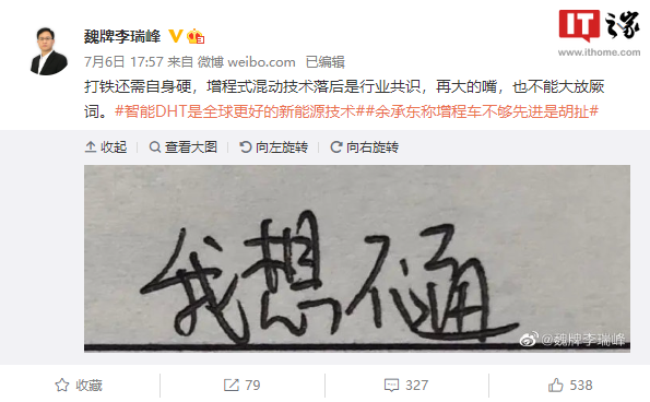 7 月 7 日消息,余承东此前接受采访时表示,增程车不够先进是胡扯,比燃油车效率更高。对此,魏牌 CEO 李瑞峰昨晚在微博发文称:打铁还需自身硬,增程式混动技术落后是行业共识,再大的嘴,也不能大放厥词。还配有一张“我想不通”的图片,并在博文最后加了一个话题词:“余承东称增程车不够先进是胡扯”