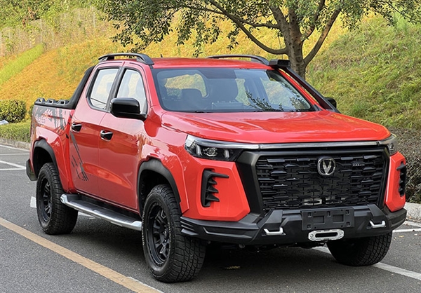 从实车照片来看,长安全新皮卡整车极为霸气,大嘴式熏黑进气中网、格栅上方为贯穿式灯组,车身线条较为硬朗。