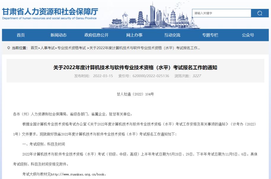 了解其他《关于2022年度计算机技术与软件专业技术资格(水平)考试报名工作的通知》,可进入甘肃省人力资源和社会保障厅网站查看。