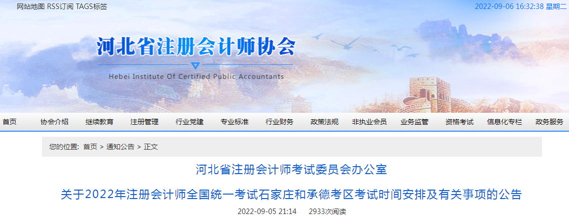2022年9月5日消息,河北省注册会计师协会发布了《关于2022年注册会计师全国统一考试石家庄和承德考区考试时间安排及有关事项的公告》,公告中明确说明了2022年河北石家庄、承德注册会计师考试时间为9月23日至25日。
