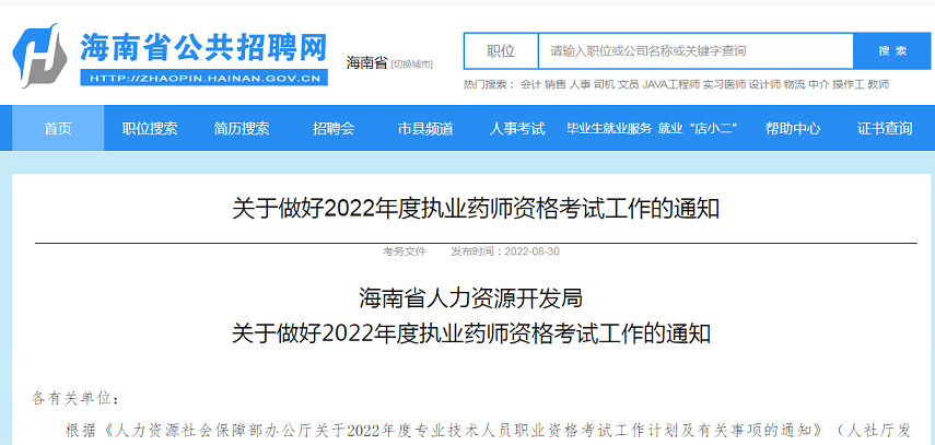 海南省公共招聘网发布的《关于做好2022年度执业药师资格考试工作的通知》