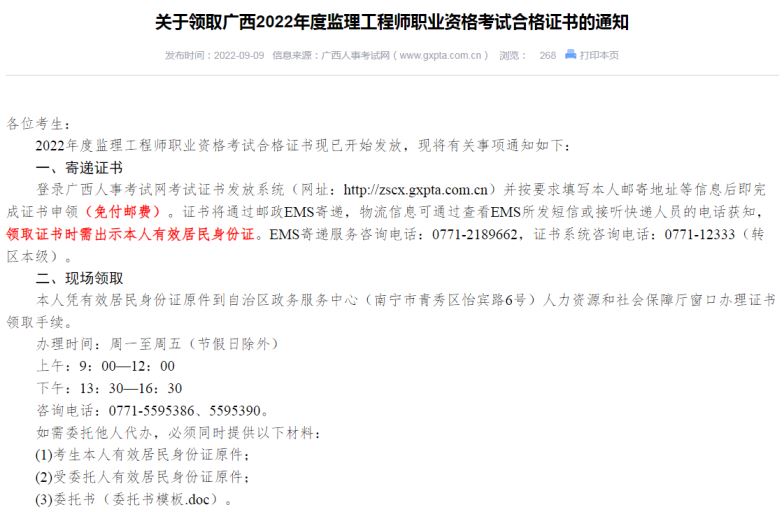 近日广西人事考试网发布关于关于领取广西2022年度监理工程师职业资格考试合格证书的通知,合格证书现已开始发放。考生可登录广西人事考试网考试证书发放系统并按要求填写本人邮寄地址等信息后即完成证书申领(免付邮费)。