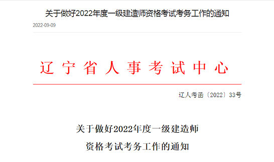 2022年9月9日,辽宁人事考试网发布关于做好2022年度一级建造师资格考试考务工作的通知,通知明确,辽宁省2022年一级建造师考试报名时间为2022年9月15日9∶00-9月22日24∶00。