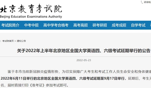 鉴于本市当前新冠肺炎疫情形势,为切实保障广大考生和考试工作人员生命安全和身体健康,原定于2022年6月11日举行的北京地区全国大学英语四、六级考试延期至9月17日举行。延期后,考生无需再次报名,届时直接打印《准考证》参加考试即可。