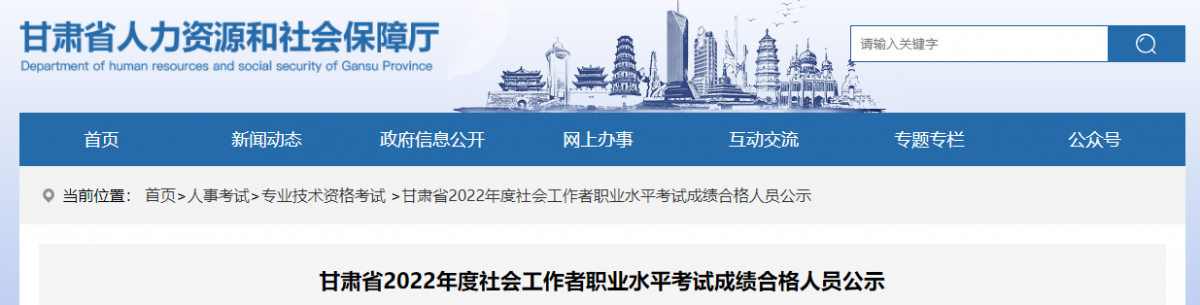 甘肃省人力资源和社会保障厅发布甘肃省2022年度社会工作者职业水平考试成绩合格人员公示通知,公示期为2022年9月9至2022年9月18日,名单如下: