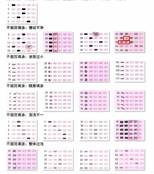 规范填涂:位置要准、填涂要满、色度要深、力度均匀、不污损、不乱划