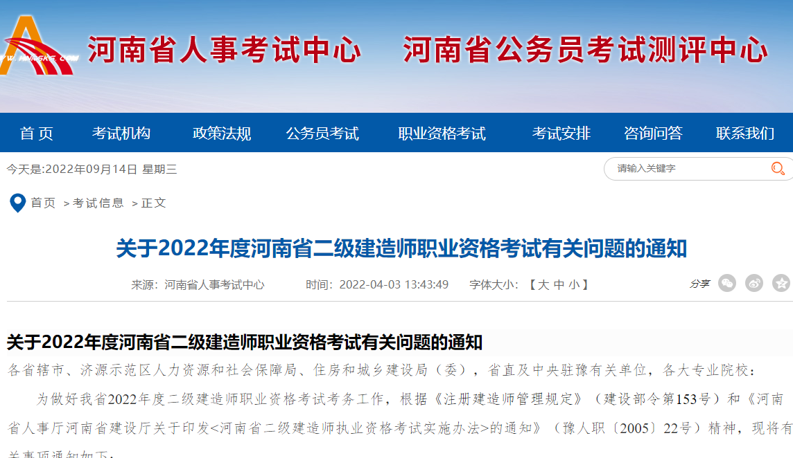 2022年4月3日,河南省人事考试中心发布通知《关于2022年度河南省二级建造师职业资格考试有关问题的通知》,该通知公布了二级建造师的考试时间、考试科目、考点设置、报考要求等一系列内容。