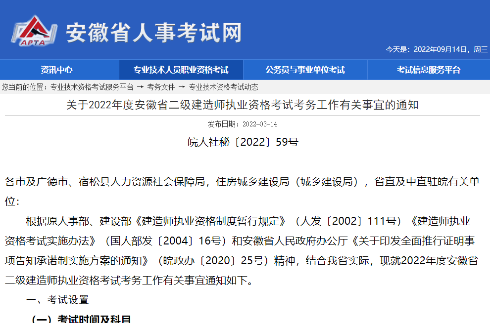 2022年3月14日,安徽省人事考试网发布通知《关于2022年度安徽省二级建造师执业资格考试考务工作有关事宜的通知》,该通知公布了考试时间、考试科目、报考条件、报考流程等信息。