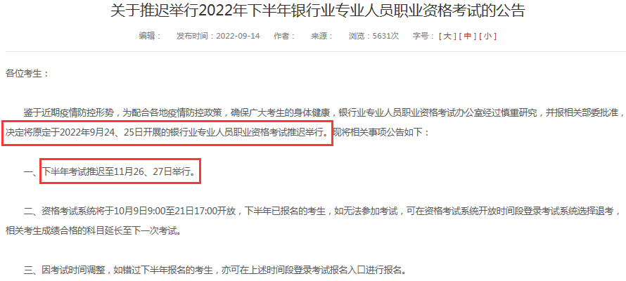 鉴于近期疫情防控形势,为配合各地疫情防控政策,确保广大考生的身体健康,银行业专业人员职业资格考试办公室经过慎重研究,并报相关部委批准,决定将原定于2022年9月24、25日开展的银行业专业人员职业资格考试推迟举行。现将相关事项公告如下: