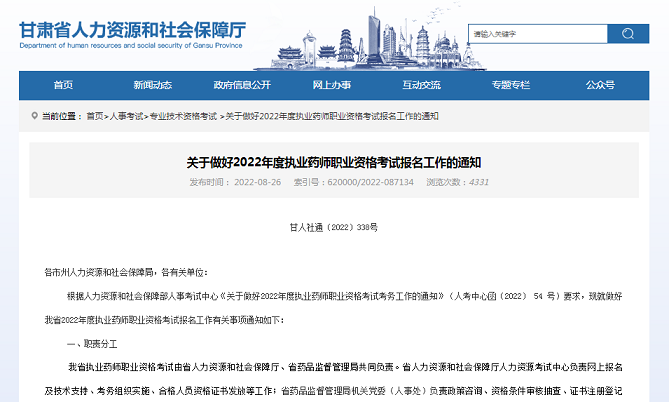 甘肃省人力资源和社会保障厅发布的《关于做好2022年度执业药师职业资格考试报名工作的通知》