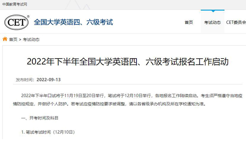 中国教育考试网《2022年下半年全国大学英语四、六级考试报名工作启动》