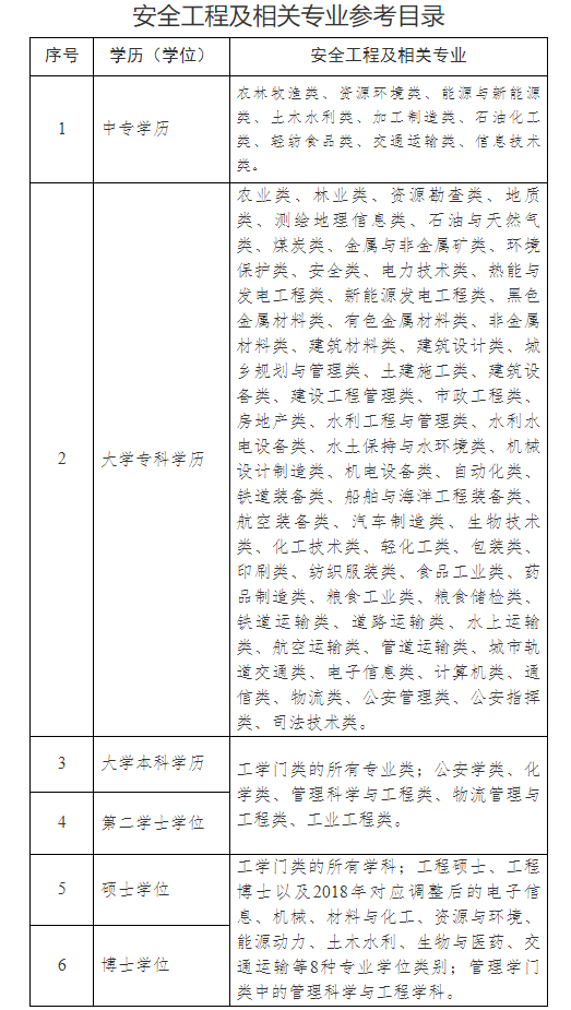 安全工程及相关专业参考目录见附件2。上述报考条件中有关学历或学位要求是指经国家教育行政部门承认的正规学历或学位;全日制学历报考人员未毕业期间经历不计入相关专业年限。工作年限、从事安全生产业务工作年限可累计,计算截止日期为2022年12月31日。