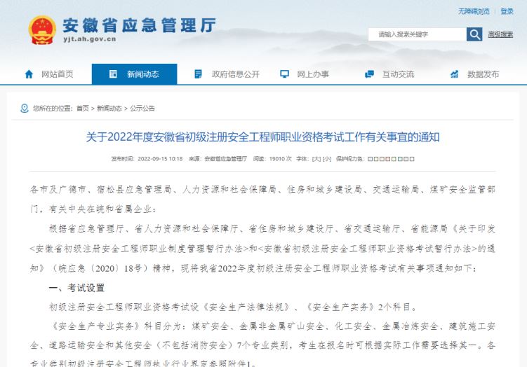若想了解其他《关于2022年度安徽省初级注册安全工程师职业资格考试工作有关事宜的通知》的内容,可进入安徽应急管理厅网站查询。
