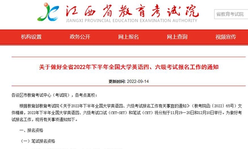 江西省教育考试院《关于做好全省2022年下半年全国大学英语四、六级考试报名工作的通知》