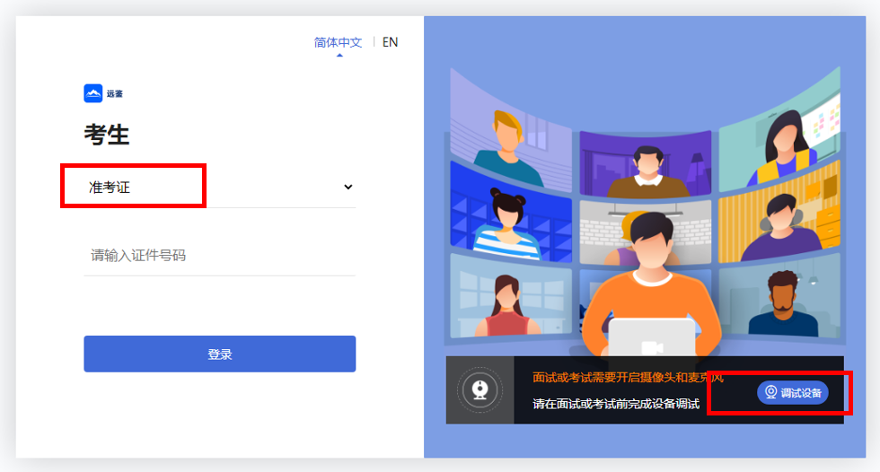 请注意:考生可在考试开始前,在登录界面中,点击“设备调试”按钮,进行调试考试设备和监控设备。