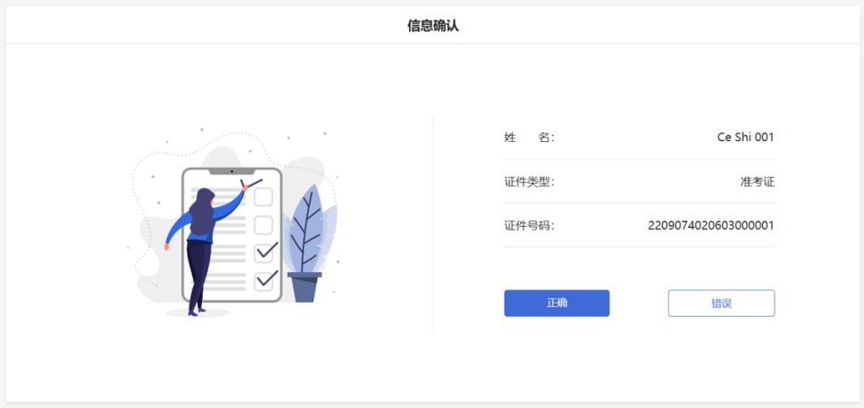 完成登录后,考生确认自己的基本信息(根据实际考试基本信息为准,下图仅为样图),点击正确按钮继续。