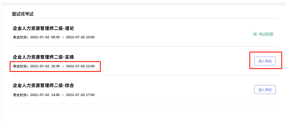 考生在信息确认后,将看到“考试”列表。通常情况下,考生只会看到当日的考试。根据考试时间找到对应的考试场次,然后点击该场次右侧的“进入考试”。请注意:根据考试时间进入相对应科目的考试。