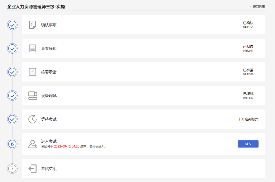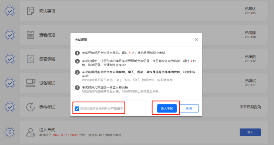 进入考试前,需逐一阅读或确认以下内容:确认事项、查看须知、签署承诺书、设备调试、开启副视角。