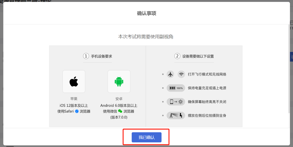 考生在考试开始前,需要了解考试所需设备的软件要求以及设备设置的提示。考生确认已按要求准备完毕后,点击“我已确认”,进入下一环节。