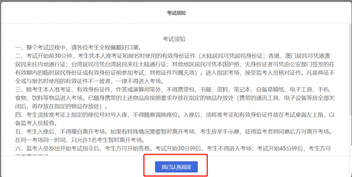 考生需要阅读考试须知,点击“阅读须知”按钮将显示考试须知。阅读完成后点击“我已认真阅读”。(下图仅为示例,请以正式考试界面显示为准)