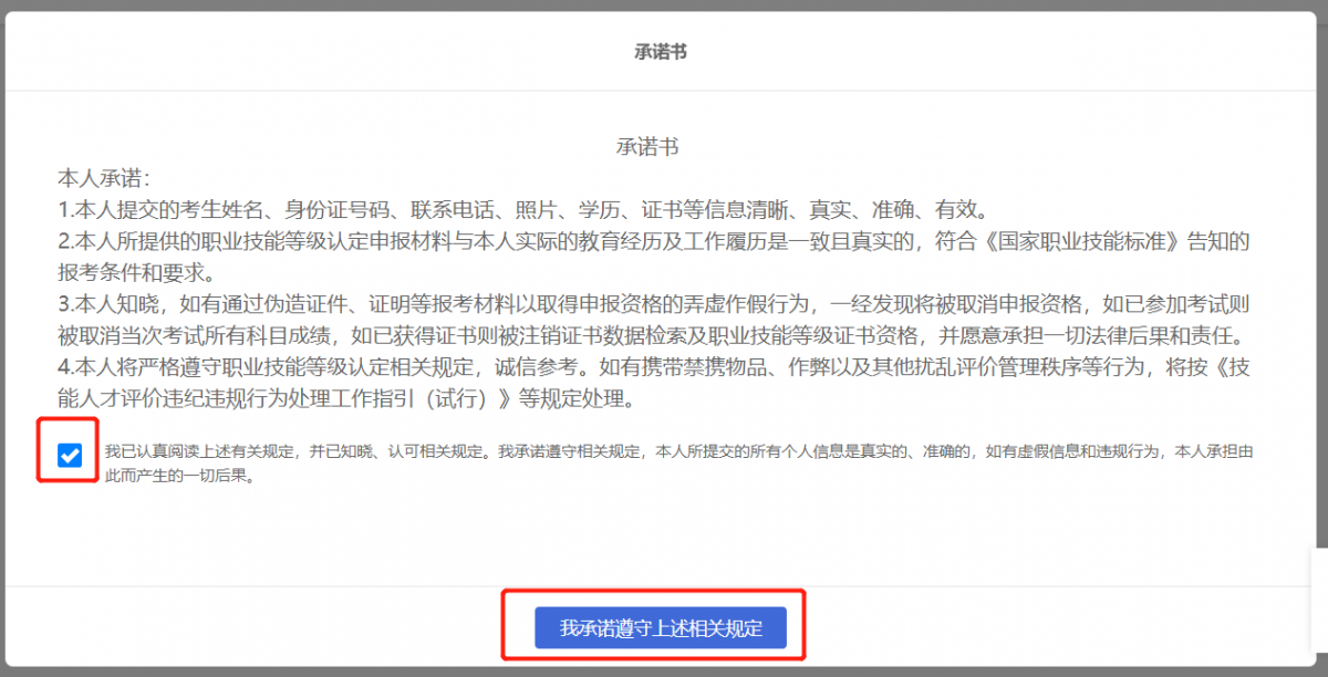 考试须知阅读后,考生接下来需要阅读承诺书,并同意。点击“阅读承诺”按钮将显示承诺书的内容,请认真阅读。阅读后若认可此承诺, 则需要先勾选“我已认真阅读上述有关规定,并已知晓、认可相关规定。我承诺遵守相关规定,本人所提交的所有个人信息是真实的、准确的,如有虚假信息和违规行为,本人承担由此而产生的一切后果。”, 然后点击“我已认真阅读并同意”。(下图仅为示例,请以正式考试界面显示为准)