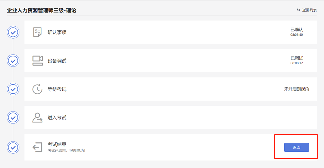 当考试时间结束或在允许交卷的时间范围内,考生可点击交卷按钮,结束当前科目的考试。如考试包含多个科目,考生需在交卷本科目后,在考试步骤界(图16)面点击“返回”按钮,回到考试列表界面,选择进入下一场科目的考试。