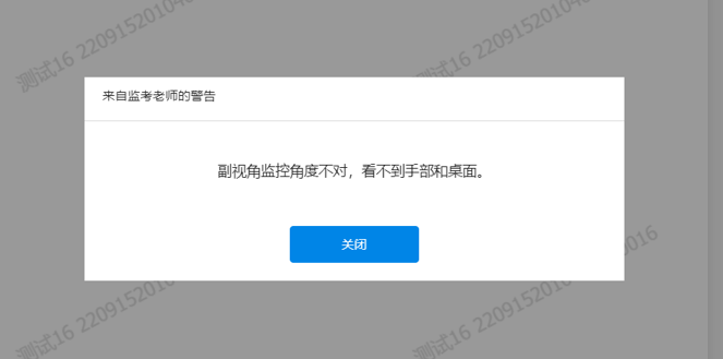 监考官在考生出现违纪或不符合考试要求的情况时,将发送文字警告信息提醒考生调整。(图17)警告信息将出现在答题界面中,考生需根据警告信息进行改正后,再点击关闭按钮后,继续进行答题。
