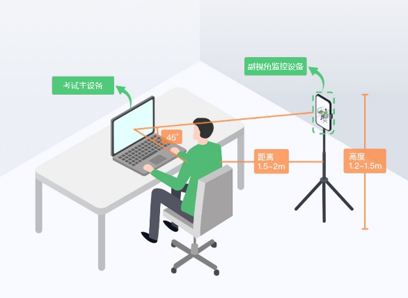 本场考试将使用双视角监控方案,(正面主视角+侧后方副视角)相结合的在线监控方式,考生应配合进行监控环境的布置以满足监控要求。