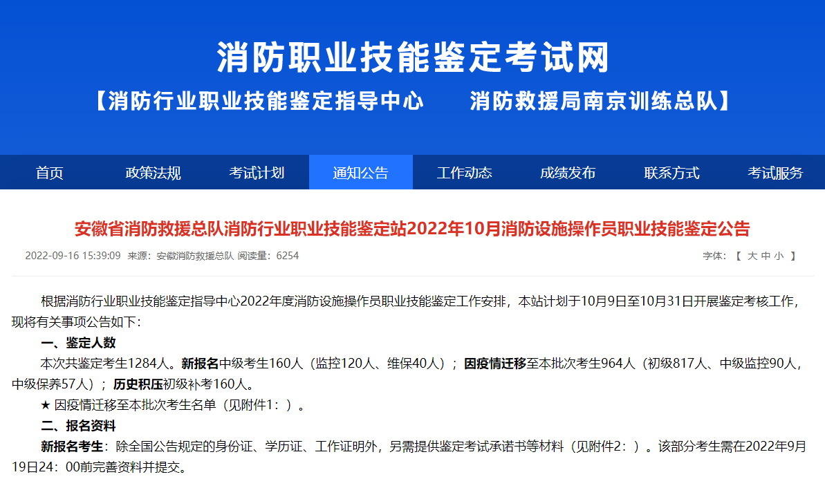 9月16日,消防职业技能鉴定考试网消防设施操作员安徽鉴定站发布了《安徽省消防救援总队消防行业职业技能鉴定站2022年10月消防设施操作员职业技能鉴定公告,安徽鉴定站计划于10月9日至10月31日开展初级消防员鉴定考核工作。公告内容如下: