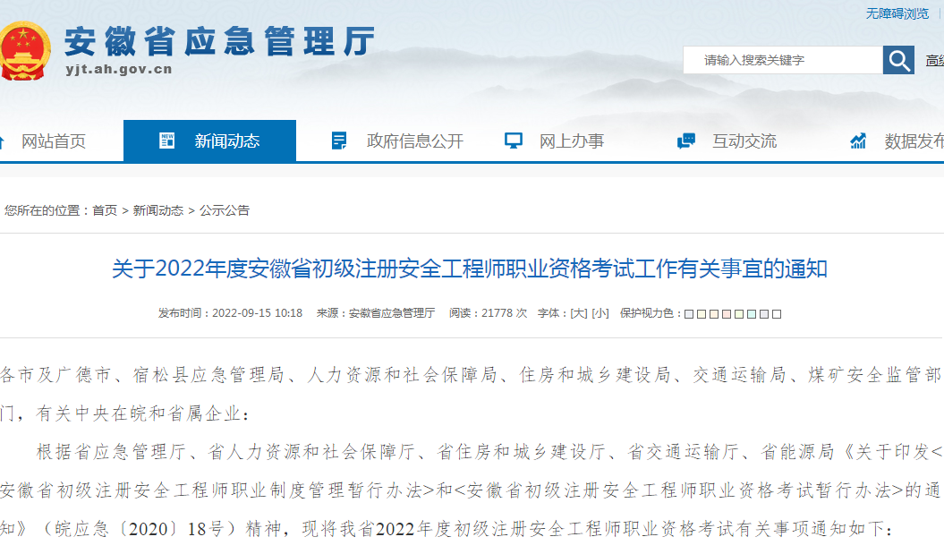 9月15日,安徽省应急管理厅发布了《关于2022年度安徽省初级注册安全工程师职业资格考试工作有关事宜的通知》。通知中提到2022年度安徽省初级注册安全工程师职业资格考试报名时间:9月16日至22日,通知中与2022年安徽注册初级安全工程师报名时间相关原文如下: