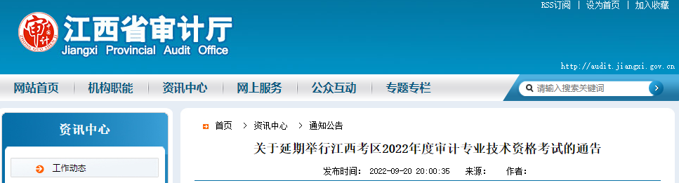 根据近期江西省新冠肺炎疫情形势和疫情防控工作有关要求,为最大限度减少人员流动聚集,切实保障广大应试人员生命和健康安全,经研究,决定延期举行原计划于9月25日在南昌举行的2022年度审计专业技术资格考试。后续有关事宜,请及时关注江西人社微信公众号和江西人事考试网”发布的后续公告。