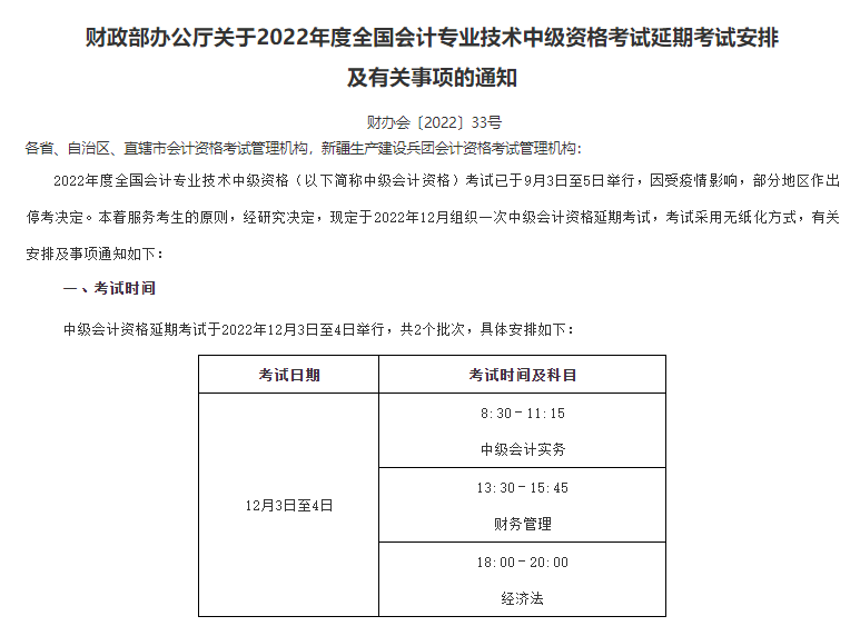 (二)2022年12月3日至4日组织中级会计资格延期考试。