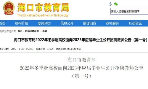 近日,海口市教育局发布《海口市教育局2022年冬季赴高校面向2023年应届毕业生公开招聘教师公告(第一号)》,明确报名时间为 2022年11月10日 09:00 - 2022年12月10日 17:00,提醒考生按时报名。