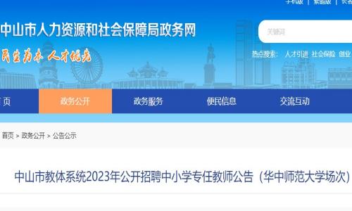 近日,中山市人力资源和社会保障局政务网发布《中山市教体系统2023年公开招聘中小学专任教师公告(华中师范大学场次)》,明确报名时间为自公告发布之日起至2022年11月28日,提醒考生按时报名。
