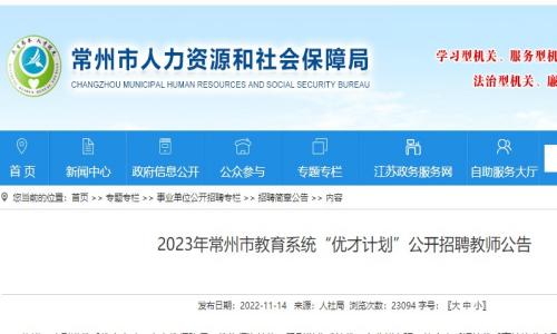 近日,常州市人力资源和社会保障局发布《2023年常州市教育系统“优才计划”公开招聘教师公告》,明确报名时间为2022年11月21日 09:00 - 2022年11月23日 15:00,提醒考生按时报名。