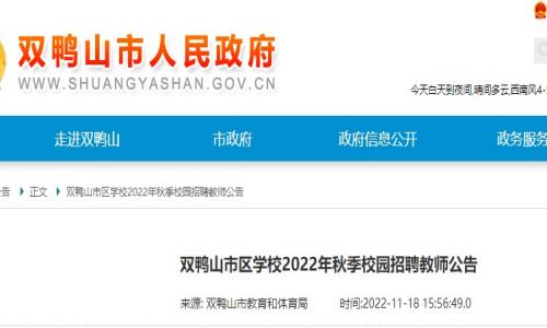 近日,双鸭山市人民政府发布《双鸭山市区学校2022年秋季校园招聘教师公告》,明确报名时间为2022年11月25日8:30至12月1日15:00,提醒考生按时报名。
