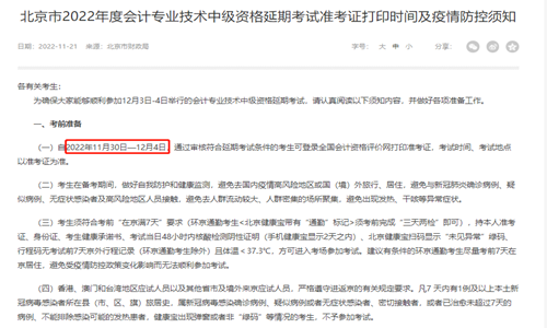 近日,本站编辑根据北京市财政局发布的“北京市2022年度会计专业技术中级资格延期考试准考证打印时间及疫情防控须知”获知2022年北京中级会计师延期考试准考证打印时间为11月30日至12月4日。