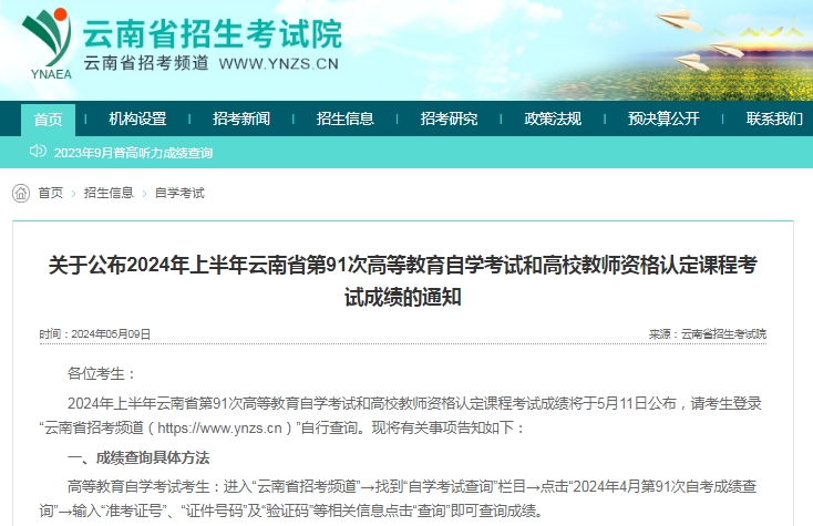 2024年上半年云南省第91次高等教育自学考试和高校教师资格认定课程考试成绩将于5月11日公布,请考生登录云南省招考频道(https://www.ynzs.cn)自行查询。现将有关事项告知如下: