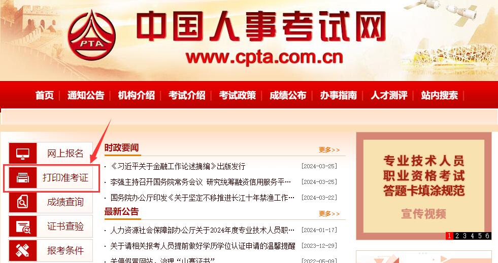 1、登录中国人事考试网(http://www.cpta.com.cn/index.html),点击页面左边【准考证打印】,进入准考证打印界面。