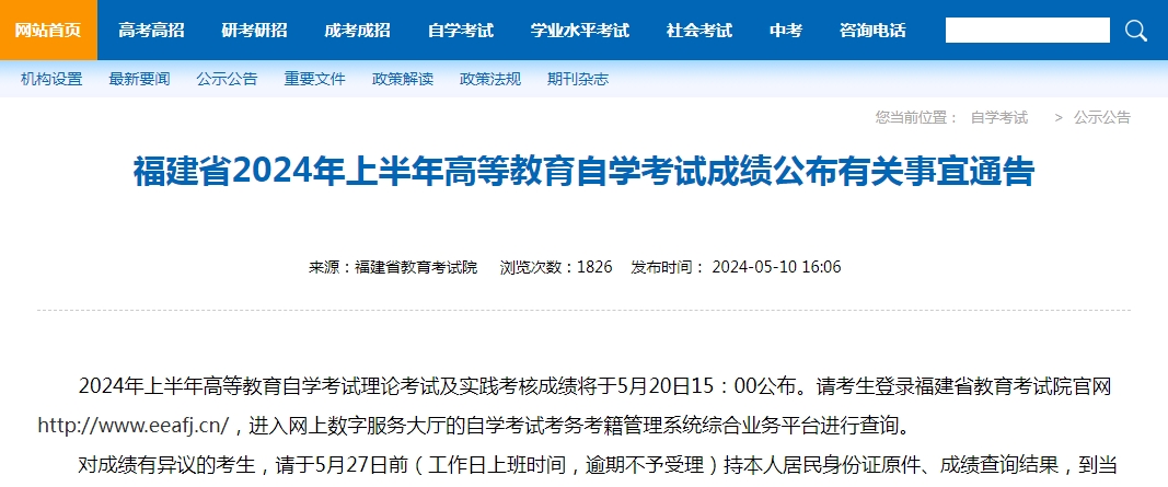 2024年上半年高等教育自学考试理论考试及实践考核成绩将于5月20日15:00公布。请考生登录福建省教育考试院官网http://www.eeafj.cn/,进入网上数字服务大厅的自学考试考务考籍管理系统综合业务平台进行查询。