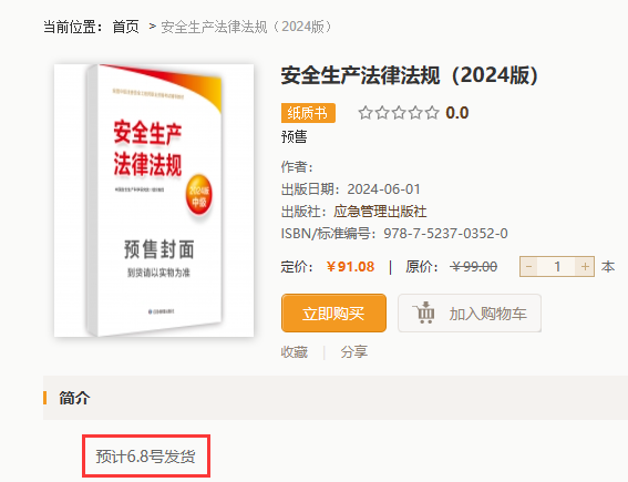 应急管理出版社网站页面显示为:6月8日左右发货。
