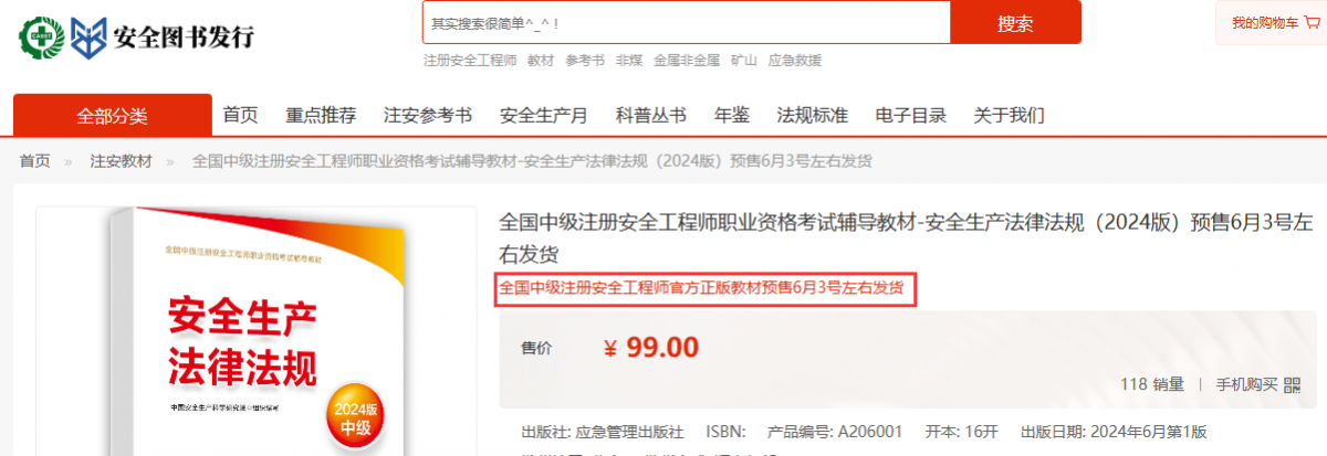 2024年中级注册安全工程师考试教材预计6月初发布,现在正在预售中,小编建议大家购买宜早不宜迟。等到新教材上市后再购买,各大书店订单爆满,发货速度会非常慢。现在在预售期购买,新教材上市前一天就会优先发货,免排队。省时又省心,还能提前备考!