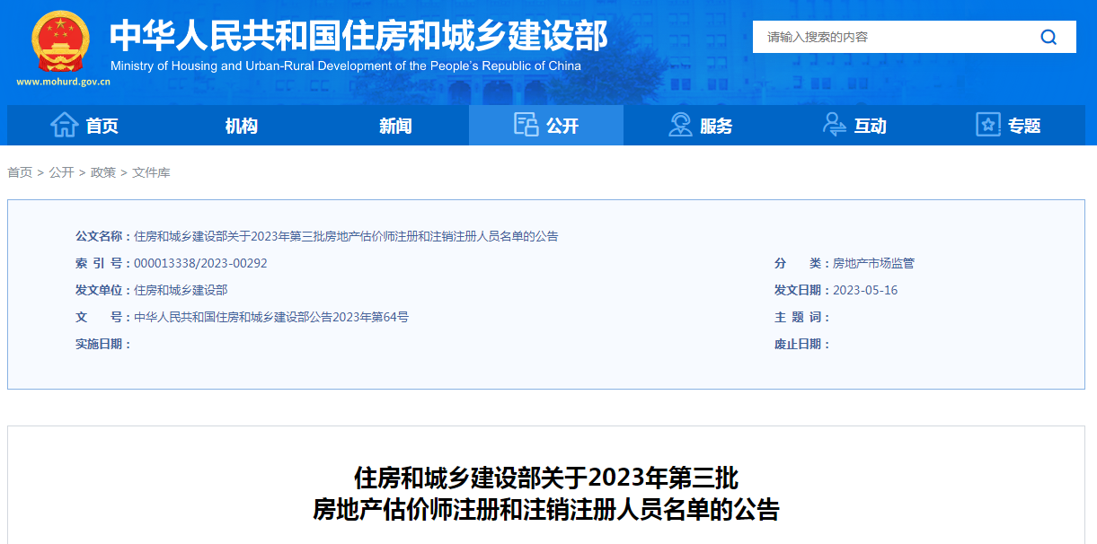 住房和城乡建设部关于2023年第三批房地产估价师注册和注销注册人员名单的公告