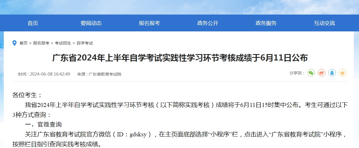 我省2024年上半年自学考试实践性学习环节考核(以下简称实践考核)成绩将于6月11日15时集中公布。考生可通过以下3种方式查询: