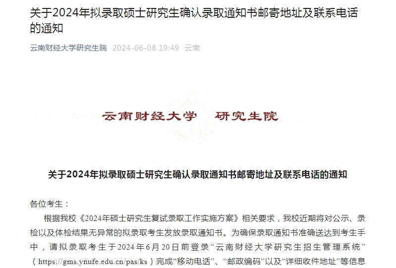 根据我校《2024年硕士研究生复试录取工作实施方案》相关要求,我校近期将对公示、录检以及体检结果无异常的拟录取考生发放录取通知书。为确保录取通知书准确送达到考生手中,请拟录取考生于2024年6月20日前登录云南财经大学研究生招生管理系统(https://gms.ynufe.edu.cn/pas/ks)完成“移动电话、邮政编码以及详细收件地址等信息的确认。逾期未确认者,邮寄地址及联系电话将按报名时填写的信息寄出,若由此造成录取通知书无法准确送达的,后果由考生本人自行承担。录取通知书预计将于2024年7月初发出,具体发放时间,请密切关注我校研究生院网站有关通知。